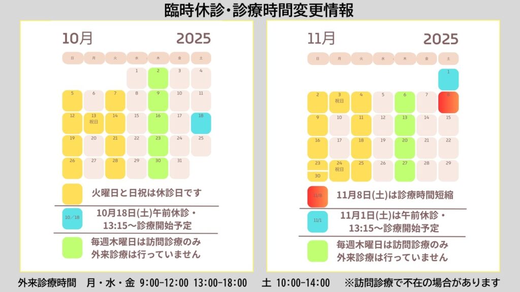【臨時休診情報】 ・10月18日(土)午前休診・11月1日(土)午前休診・11月8日(土)診療時間短縮予定