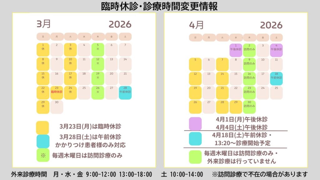 【3月の診療予定】 3月23日(月)臨時休診 ・3月28日(土)は午前休診(かかりつけの方のみ対応します)